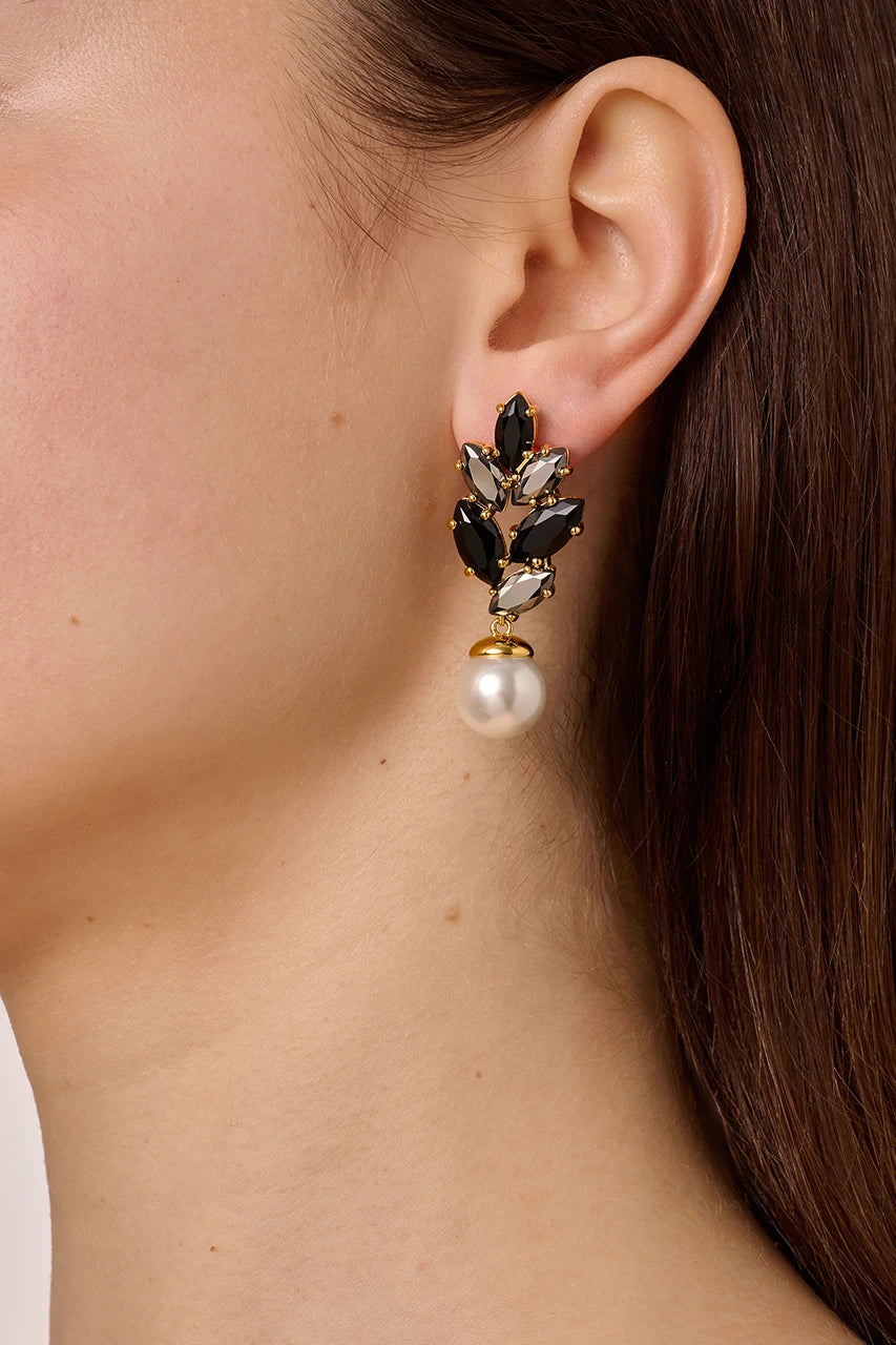 BALETE – Kvenlegir, glæsilegir eyrnalokkar sem henta fullkomlega fyrir viðburði og hátíðleg tilefni. Efri hlutinn er lauflaga og þakinn maríuhnoðraformuðum (navette) kristöllum í mismunandi litbrigðum, og neðan við hangir 10 mm hvít eftirlíkingarperla sem bætir við klassískum blæ.
