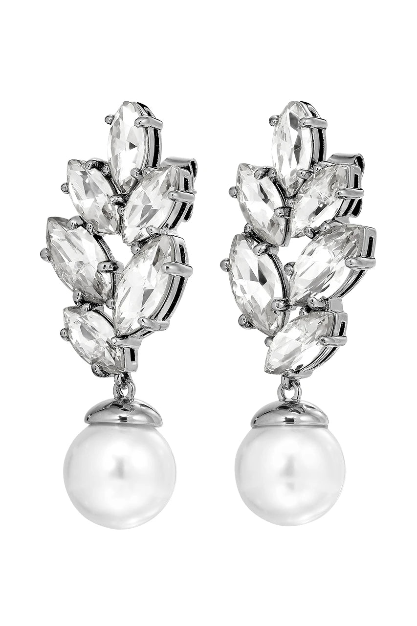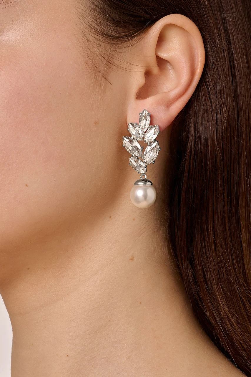 BALETE – Kvenlegir, glæsilegir eyrnalokkar sem henta fullkomlega fyrir viðburði og hátíðleg tilefni. Efri hlutinn er lauflaga og þakinn maríuhnoðraformuðum (navette) hvítum kristöllum, og neðan við hangir 10 mm hvít eftirlíkingarperla á silfurlituðu yfirborði sem gefur klassískan og glæsilegan blæ.