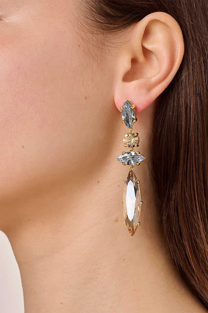 TENERE – Einstaklega glæsilegir og lengri eyrnalokkar sem draga að sér athygli hvar sem þú kemur fram. Fallegir kristallar í mismunandi ávölum og maríuhnoðraformum (navette) eru fínlega slípaðir og raðað saman í andstæðum litum og formum sem skapa glitrandi og áhrifaríkt útlit. Hver kristall er festur í léttan grunn úr fáguðu messingi með húðun úr skurðstáli sem tryggir bæði endingu og glans.